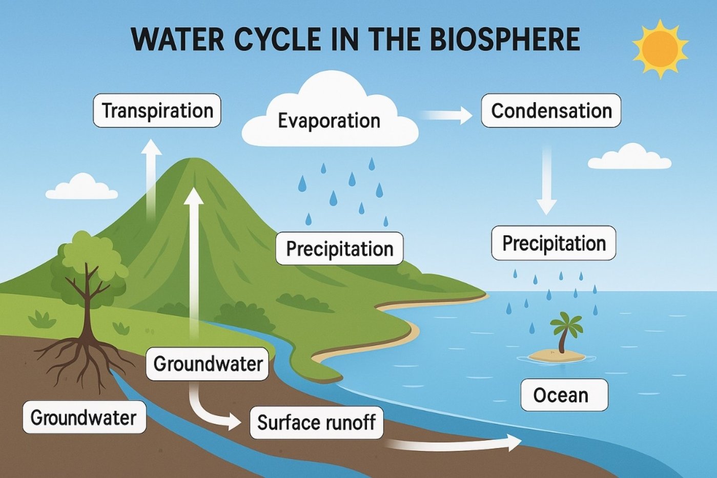 太阳能让海洋水蒸发成水蒸气,气流运动伴随水汽输送,凝结成云,形成降水返回地面,一部分水流向海洋,一部分变成地下水,再次进入水循环。