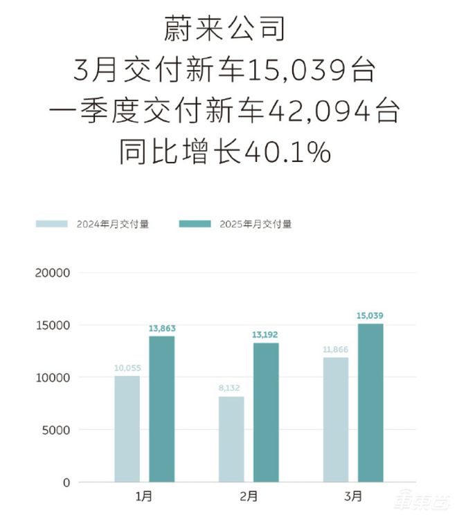 而从目前的销量情况来看,从 2025 年 1 月至 3 月,蔚来公司的累计销量为 4.21 万辆,月均销量不足 1.5 万辆。