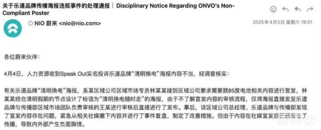 不过值得注意的是,4 月 4 日,蔚来发布了一封名为“关于乐道品牌传播海报违规事件的处理通报”的内部邮件,其中有两人被劝退处理,四人被警告处分。