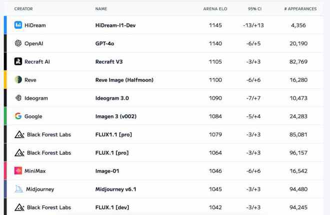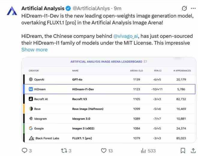 智通财经 APP 获悉,近日,本土科技公司智象未来开源图片生成模型 HiDream-I1,其在上线的 24 小时内登顶全球领先的独立 AI 基准测试与分析平台 Artificial Analysis 竞技场榜单,也是首个登顶该榜单的国产自研生成式 AI 模型。