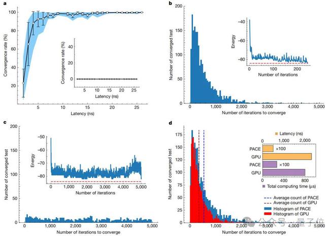 在求解 63 节点 Max-cut 问题时,系统经过平均 537 次迭代(耗时 2.7μs)即可达到 92.7% 的收敛率,相比 NVIDIA A10 GPU 提速 295 倍。