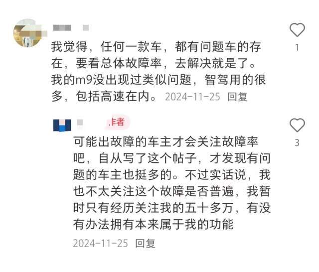 小红书上也有不少追随者。有网友称自己的 M9 并未出现上述智驾的类似问题,日常使用中频繁启用智驾功能,一切都很正常。