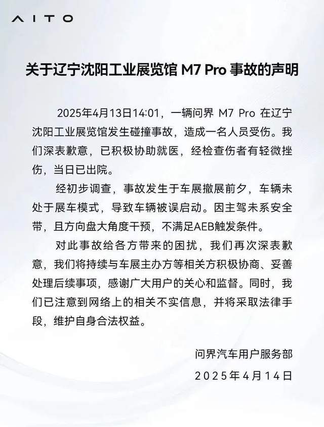 4 月 14 日,问界汽车用户服务部发布声明:“事故发生于车展撤展前夕,车辆未处于展车模式,导致车辆被误启动。因主驾未系安全带,且方向盘大角度干预,不满足 AEB(自动紧急刹车系统,属于智能辅助驾驶系统的核心组成部分)触发条件。对此事故给各方带来的困扰,我们再次深表歉意,我们将持续与车展主办方等相关方积极协商、妥善处理后续事项,感谢广大用户的关心和监督。”