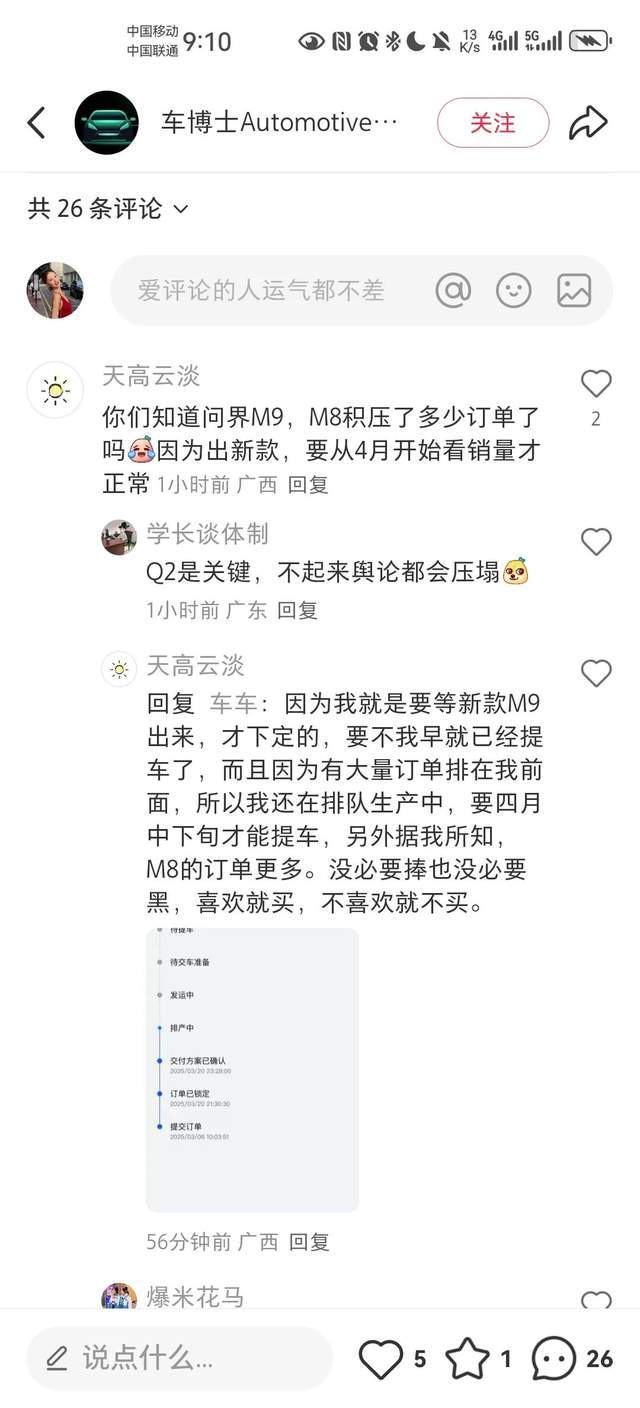 另外,也有网友透露,自己正心心念念地等着最新款 M9。由于问界 M9 新款发布,导致订单积压,自己因等待新款 M9 推迟购车计划,目前订单仍在生产队列中,预计四月中下旬才能提车,否则早就提车了。因此,建议大家关注赛力斯 4 月起的实际销量数据。