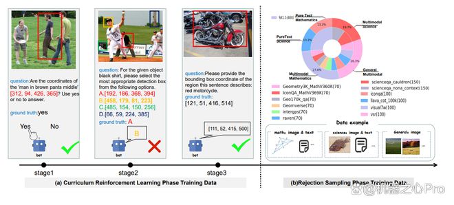 图 3. 训练数据组织架构图。 (a) 课程强化学习的三阶段渐进式响应格式示例。展示了任务从简单到困难的递进过程,呈现不同阶段的响应格式变化。 (b) 拒绝采样 SFT 阶段使用的数据来源分布。
