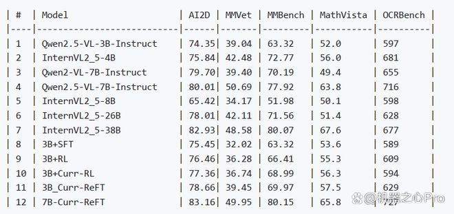 为了验证 Curr-ReFT 的泛化性以及使用后不会削弱模型在其他领域的推理能力,我们在多模态领域多个 Benchmark 数据集上进行验证。Benchmarks 上不同方法模型的测试结果如下(评测集裁判模型使用 GPT-3.5):