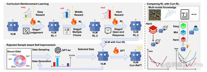 图 2. 所提出的 Curr-ReFT 后训练范式整体框架。Curr-ReFT 包含两个连续的训练阶段:1.课程强化学习:通过与任务复杂度匹配的奖励机制,逐步提升任务难度。2.基于拒绝采样的自我改进:维持 LLM 模型的基础能力。