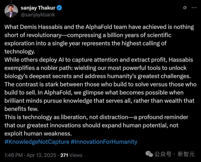 LinkedIn 联创、致力于用 AI 治疗癌症的 ReidHoffman 转发了 Hassabis 讲话的这段视频,引起了网友们的热烈反响。