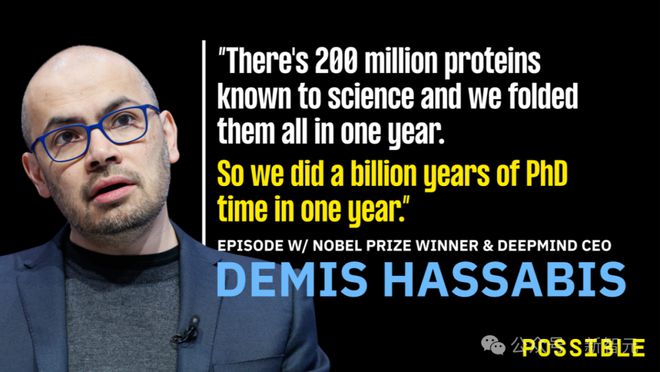 在交流中, Hassabis 解释了为什么他认为 DeepMind 将 10 亿年的博士研究时间压缩到一年: