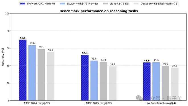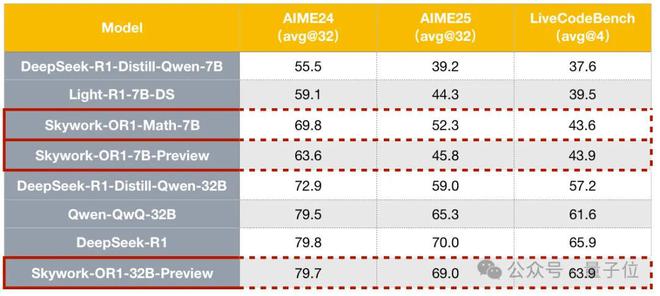 数学推理方面:7B、32B 都达到同规模最优,数学专项模型(Skywork-OR1-Math-7B)表现更突出。