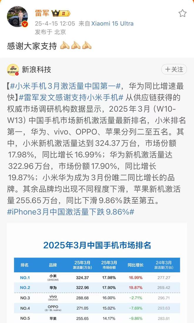据报道,从供应链获得的权威市场调研机构数据显示,2025 年 3 月(W10-W13)中国手机市场新机激活量最新排名,小米排名第一。