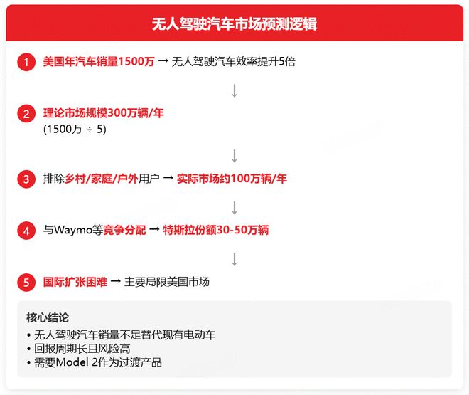 最初的一个关键假设是,美国的汽车市场年销量可能从 1500 万辆缩减至大约 300 万辆,因为 Robotaxi 的使用时长是传统私家车的五倍——后者长时间停放在车道或停车场中。