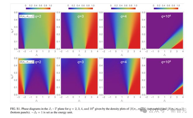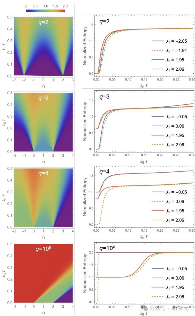 因此,每个临界点在J_1−T相图中随着温度升高发展出V形区域(图 2 左,q=2,3,4)。