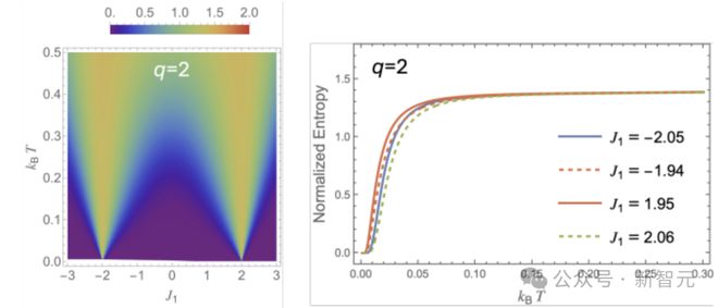 图 2 左:在J_1−T平面上,归一化熵 2S (J_1,T)/ln (q)的密度图。