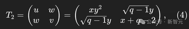 由此得到的变换矩阵是一个q^2×2 矩阵,它将q^2×q转移矩阵T投影到与其余部分解耦的2×2 块矩阵T_2,并且该矩阵由于不同的对称性,得到如下方程4: