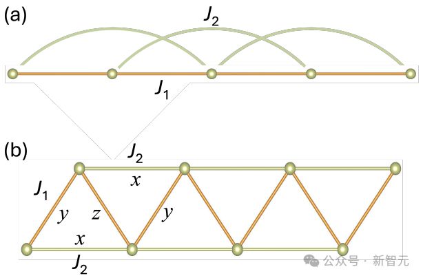 图1:(a)单链J_1−J_2 Potts 模型的示意图和(b)其等效的锯齿梯形表示。图中的小球代表具有q个状态的自旋。橙色的键表示最近邻相互作用J_1,绿色的键表示次近邻相互作用J_2