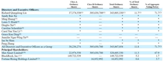 刘强东旗下 Max Smart Limited 持股为 11.3%,有 67.9% 投票权;员工持股平台 Fortune Rising Holdings 持股为 0.6%,有 3.7% 的投票权。