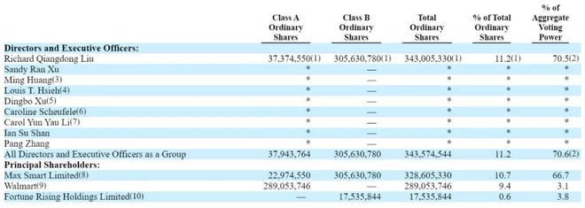 刘强东一共控制 11.2% 的股权,及 70.5% 的投票权。此外,沃尔玛持有 9.4% 股权,及 3.1% 的投票权。