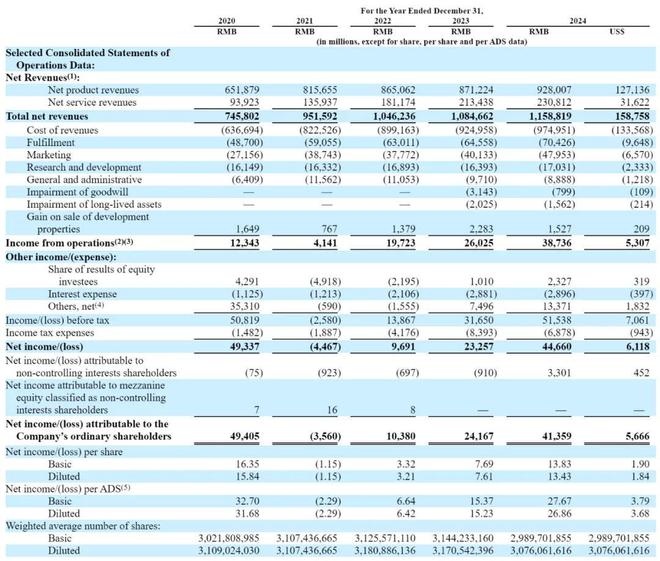 2024 年以来,京东集团的发展整体趋于平稳。年报显示,京东 2022 年、2023 年、2024 年营收分别为1,0462 亿元、1,0846.62 亿元、1,1588.19 亿元(约 1588 亿美元);
