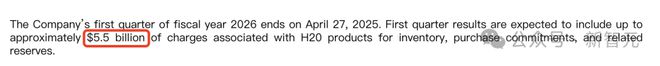 这一政策突变,对于英伟达来说,将造成 55 亿美元的损失(Q1),皆与 H20 产品线库存、采购承诺及相关储备有关。
