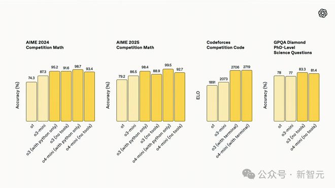 在 AIME 2025 测试中,o4-mini 配合 Python 解释器取得了 99.5% 高分,几乎完美拿下了这项基准测试。