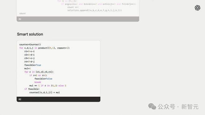 它首先生成了一个暴力程序,然后用 Python 解释器运行,并得到了正确答案,即 82。