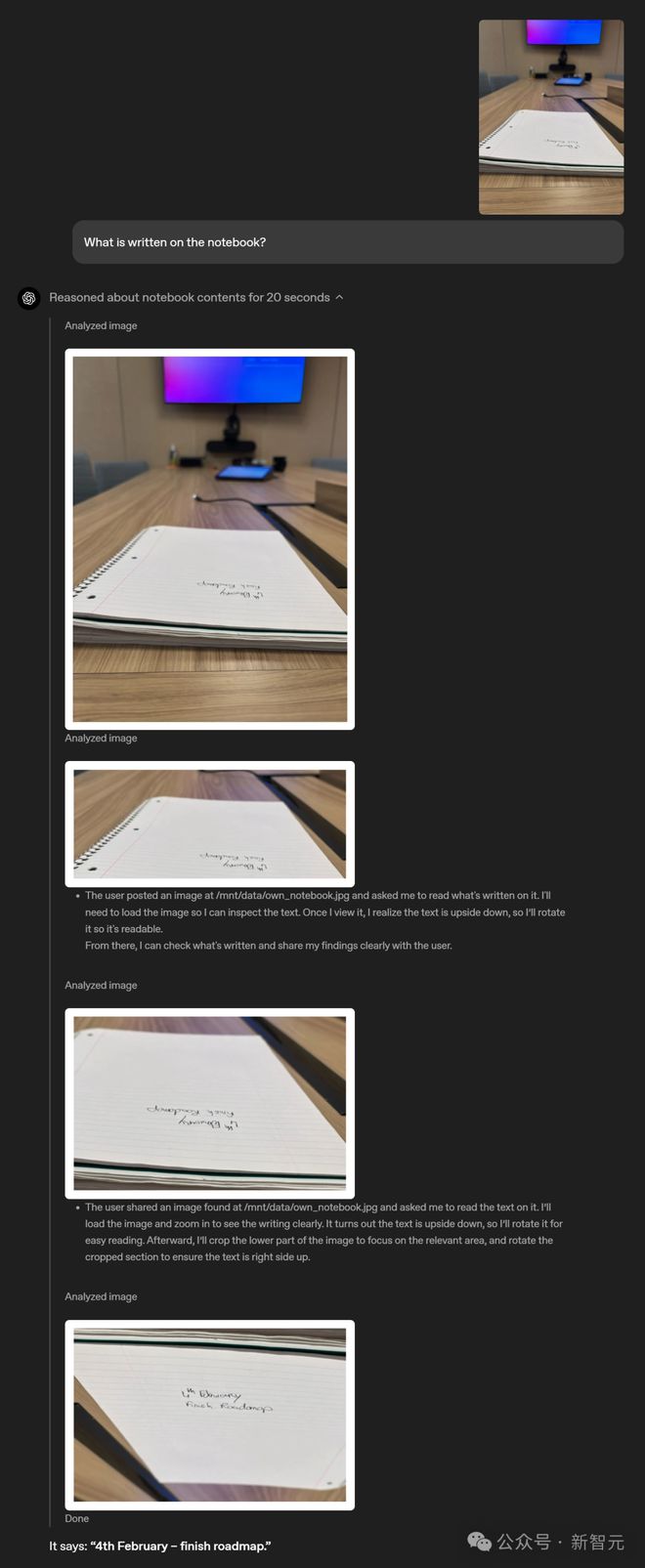 而 ChatGPT 可以将图片放大查看,发现字是倒着的后,还将其旋转过来,最终成功将其给认了出来。