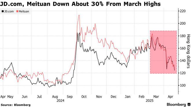 尽管特朗普政府的关税政策已对近期中国科技股反弹造成抑制,但京东与美团之间的本土博弈对市场的冲击更加显著。截至目前,两家公司均跻身恒生科技指数年内表现最差的八只成分股之列,而在 2024 年,它们还曾是表现居中的明星股。
