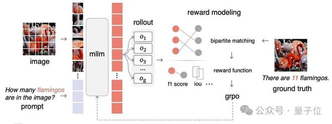 - 奖励建模:根据明确的评分标准(奖励函数)评估每次尝试。例如,对于边界框任务,使用 Intersection over Union(IoU)衡量模型输出与正确答案的重叠程度。