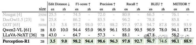 Perception-R1 的实际表现如何?研究人员在一套标准视觉感知基准上对其进行了评估,并将其与强大的基准 MLLM(如原始 Qwen2-VL-2B-Instruct)进行了比较,甚至与只为特定任务设计的专门 “专家 “模型进行了比较。