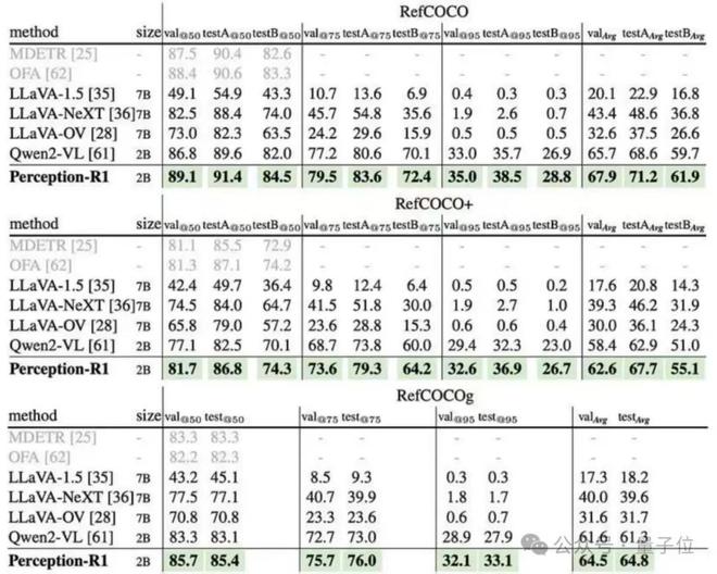 - 视觉定位(RefCOCO):预测边界框与 ground truth 的 IoU。