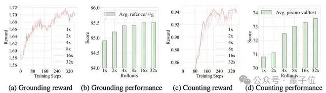 - 视觉计数(PixMo-Count):将任务重新定义为点检测后计数,奖励基于预测点与 ground truth 点的欧几里得距离。