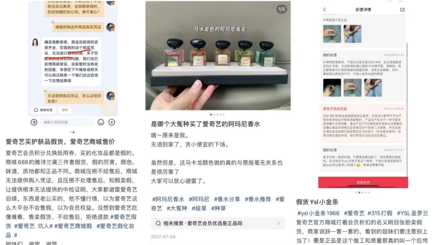 锌刻度在“爱奇艺商城”看到,目前其商城在售商品以影视剧、明星周边为主,且多为预售。此外会员可凭借积分在该商城兑换优惠券购买化妆品等。不过,在小红书等社交平台,有不少网友指出,爱奇艺买的化妆品疑似假货。其中有网友提到,在爱奇艺用会员积分兑换抵用券,花 688 元购买的雅诗兰黛三件套“假得厉害……商城无法提供凭证,且压根不处理售后,拒绝退款”。而在这篇笔记的评论区,也有不少网友提到自己买的口红、洗面奶等产品也疑似假货。