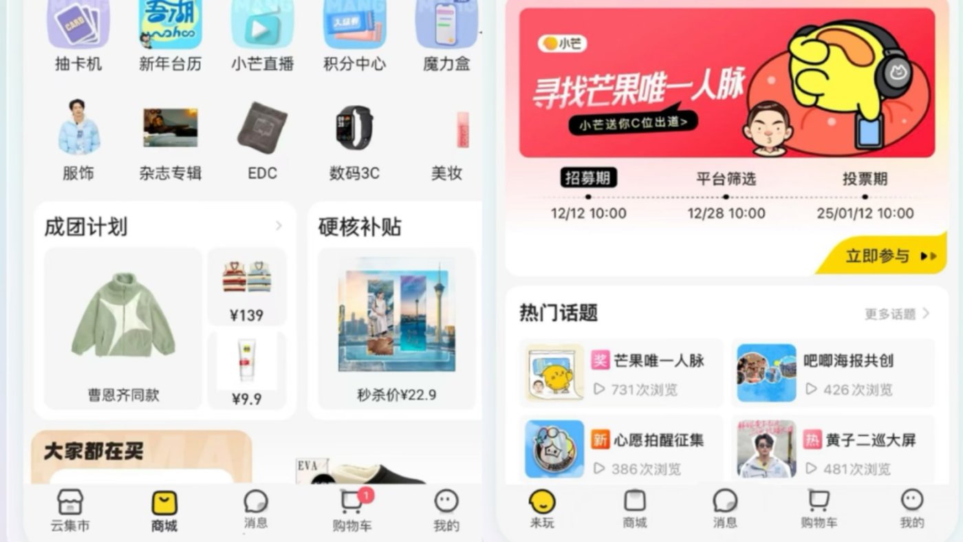 其中,芒果 TV 的小芒电商也已成立四年,定位为集合社交、内容、电商于一体的新潮国货内容电商平台。当去年《再见爱人4》的“熏鸡事变”火遍全网时,小芒电商也推出了节目同款,比如 69.9 元一只的熏鸡和 59.9 元三盒的青团。但大部分时候,其商城的商品还是以明星周边为主,比如明信片、专辑等等。