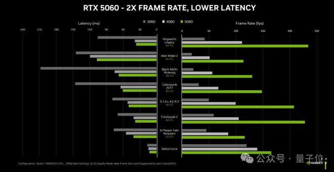 和上一代 RTX 4060 对比来看, 官方表示 5060 在支持 DLSS 4 多帧生成的游戏中,性能可达 4060 的两倍。