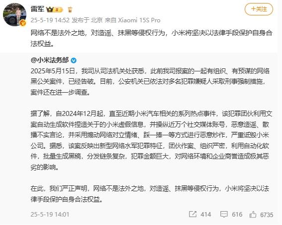 新京报贝壳财经讯 5 月 19 日,雷军发布微博称:网络不是法外之地,对造谣、抹黑等侵权行为,小米将坚决以法律手段保护自身合法权益。