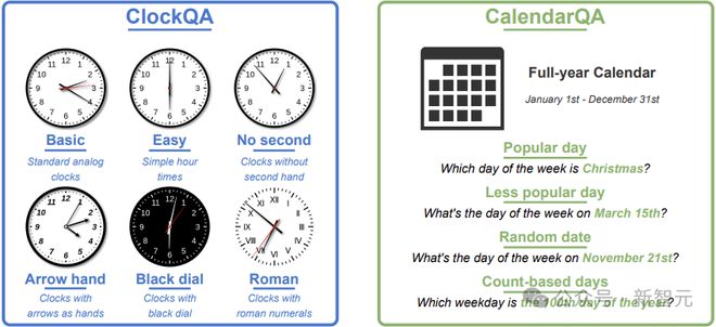 图2:DateTimeReasoning 任务概览及其两个主要子集:ClockQA 和 CalendarQA
