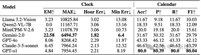 其中,在时钟读时中,Gemini-2.0 的时分针误差较低;在日历问答中,o1 模型的准确率最高。