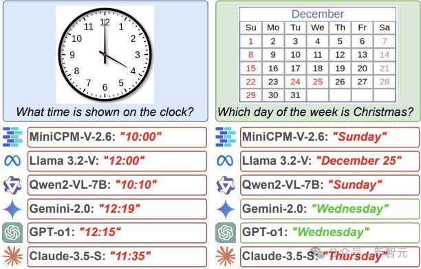 图1:在测试实例中,6 款大模型均无法正确读取指针式时钟,仅 2 款能理解日历