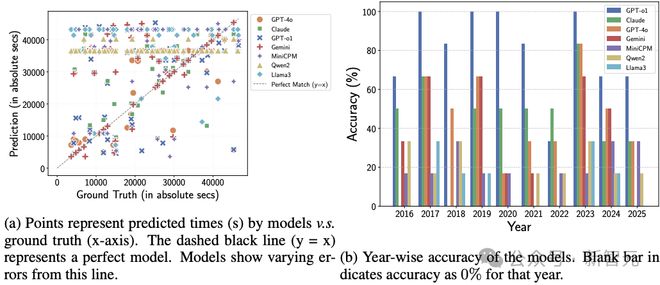 整体而言,除了 GPT-o1 在 CalendarQA 中的高表现外,其余模型在 ClockQA 和 CalendarQA 两个任务中的总体表现都不理想。