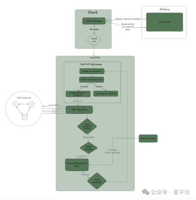 2024 年 Nous 研发的DisTrO分布式训练优化器,通过梯度压缩(仅传输关键参数更新)和异步更新策略,将跨节点通信的数据量降低 90% 以上,突破了训练过程中的带宽限制,使得训练可以去中心化。