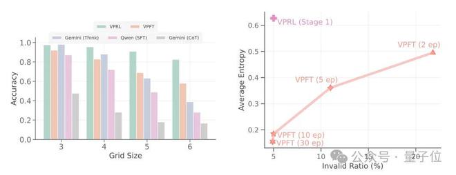 与此同时在鲁棒性上,随着网格尺寸增大(如 FrozenLake 从3×3 到6×6),VPRL 性能下降平缓(EM 从 97.6% 降至 82.4%),而 Gemini 2.5 Pro 从 98.0% 骤降至 38.8%,充分体现了 VPRL 更强的稳定性。