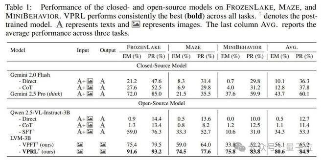 视觉规划(VPFT 和 VPRL)在所有任务上都取得了最高分,如表所示,VPRL 在三个任务中平均 EM 高达80. 6%,远超文本基线(如 Gemini 2.5 Pro 平均 EM 为 43.7%)。