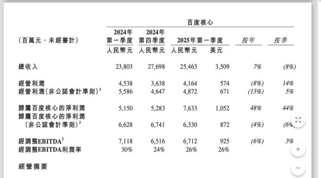 截至 2025 年 3 月 31 日,百度现金、现金等价物、受限制资金及短期投资为 1420 亿元,以及现金、现金等价物、受限制资金及短期投资(不包括爱奇艺)为 1367 亿元。自由现金流为负 89 亿元,自由现金流(不包括爱奇艺)为负 92 亿元主要由于 AI 业务投资增加。