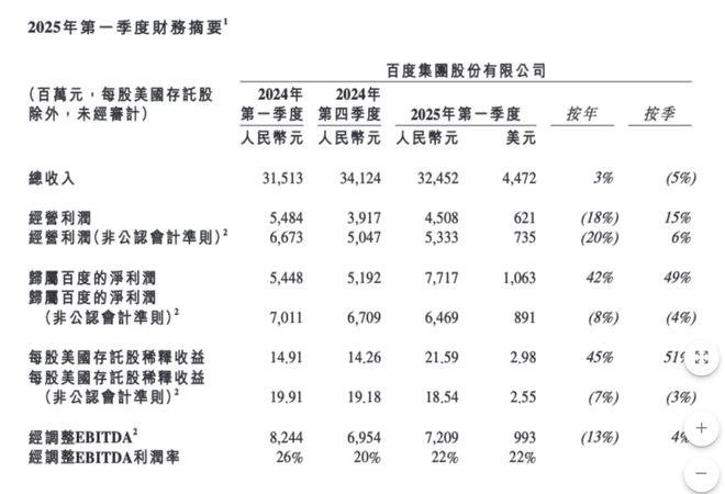 5 月 21 日晚,百度(Nasdaq:BIDU,09888.HK)发布 2025 年第一季度财报,显示一季度总营收达 324.52 亿元,同比增长3%,预估 310.3 亿元;非公认会计准则下,归属于百度的净利润 64.69 亿元,同比下降8%。