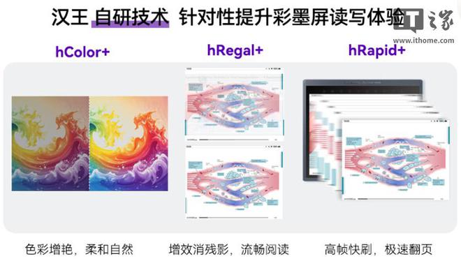 为达到更好的彩色显示效果,汉王自研 hColor + 色彩增艳算法的混色技术,在彩墨显示基础上优化饱和度与对比度,强化纸感视觉效果。此外,自研 hRegal + 增效消残影技术与自研 hRapid + 高帧快刷技术的应用,同步提升阅读流畅度与显示效果,支持第三方应用五档刷新模式自由切换。屏幕侧边还采用灵动条设计。
