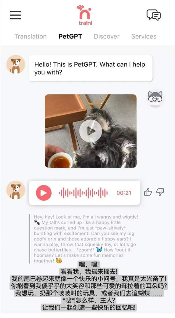 与动物交流的创想在国外也落实到了宠物领域,全球首个人宠翻译器 Traini 在 2024 年底于 iOS 程序推出,这款主要用来理解“狗狗语”的软件由一个华人团队进行开发,依靠其自主研发的 PEBI(宠物情绪与行为智能)模型,收集主要来自北美和欧洲区域应用平台上的用户社区信息,目前覆盖了 120 个不同的狗狗品种,能够检测 12 种情绪,包括快乐、恐惧等基本情绪和其之外的细微感受。用户只要上传相关的声音、图片和视频,就能实现翻译,且官方数据显示准确率高达至 81.5%。反过来,Traini 也能把用户的话语例如“看我”“一起走”转换成犬吠,传递给狗狗。
