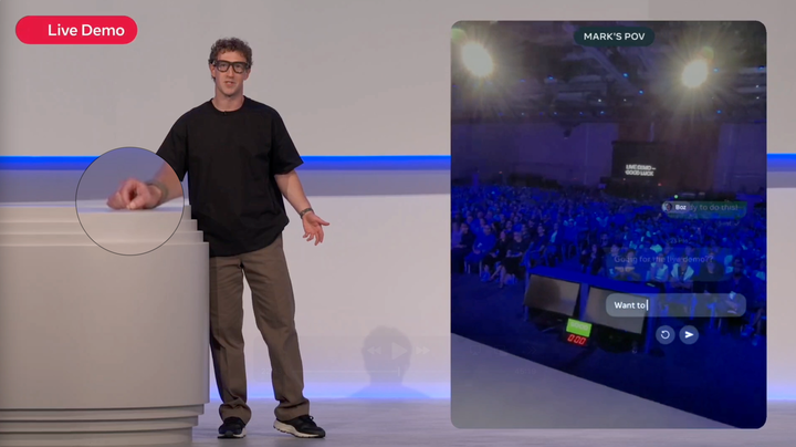 而今年的演示则更进一步,扎克伯格在现场甚至展示了一小段佩戴 Display 眼镜、通过腕带识别在桌面上手写字母的方式编辑和发送消息的过程。根据发布会的说法,腕带的手写识别速度至少在 30wpm 以上。