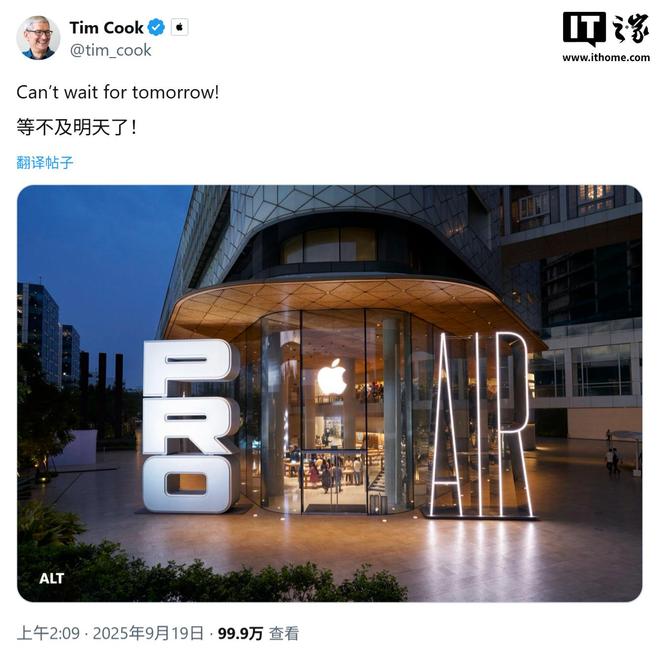 9 月 19 日消息,科技媒体 9to5Mac 今天(9 月 19 日)发布博文,报道称苹果首席执行官蒂姆・库克(Tim Cook)在 X 平台发布推文,分享了一组印度孟买 Apple BKC 零售店的照片,展示该门店通过独特的“Pro”和“Air”主题设计,吸引消费者。