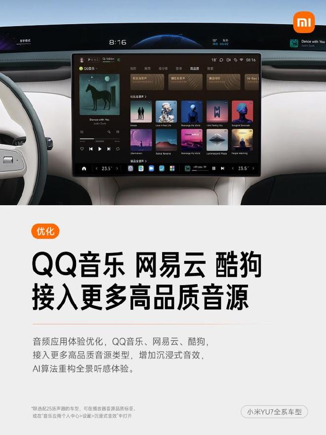 新增多屏联动全舱沉浸 K 歌:音乐应用全屏打开,或进入无麦 K 歌时,将联动小米天际屏、后排屏和氛围灯,为用户打造沉浸式听歌及演唱效果。